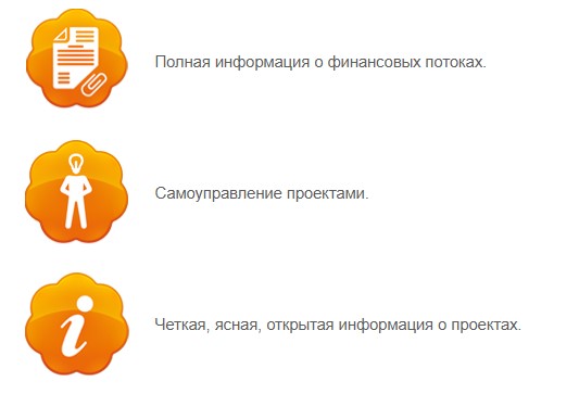 Спонсоры проекта вносят пожертвования через платежные терминалы или кассы банка на конкретный проект. Информация об оплате поступает на сайт в течении одной-двух минут. Расходы денег на оплату товаров или услуг также отражаются на сайте по факту совершения оплаты. Таким образом спонсоры и лидеры проектов могут в любой момент проконтролировать поступление и расход денег на проектах.